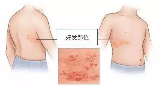 本病具有非常典型的临床表现,皮损沿周围神经分布,为簇状的红斑和水疱,呈带状排列,不超过体表正中线,并且伴有明显的神经痛。在发病早期,首先表现的是某个神经节支配区域的疼痛,疼痛程度因人而异。老年人以及头面部位的往往比较严重。平均三至四天在疼痛区域发生红斑和水泡。但是也有部分人群疼痛时间比较长、而迟迟不出现水泡,所以这种情况比较难于诊断,为此临床中有误诊各种疾病的情况发生。