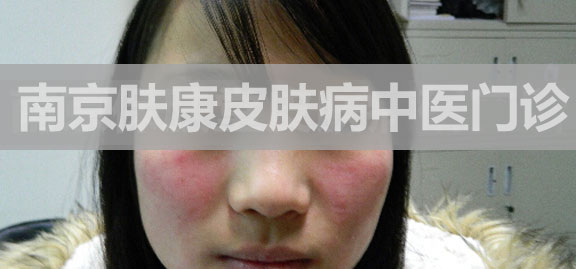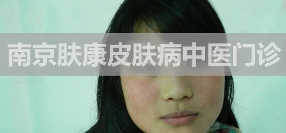 米蓉(化名),女,26岁,2个月前不明原因,面部出现红丘疹,瘙痒明显,到当地门诊诊治。具体诊断不详,给予中药外敷(药物不详)。后开始全脸出现弥漫性红潮、肿胀,红丘疹增多,部分渗液,遂到当地输液治疗(药物不详)。红肿部分消退,但丘疹、渗液未见减轻,瘙痒明显,1个星期前来南京肤康进行进一步治疗。患者患病以来,精神、睡眠欠佳,饮食、大便正常,无恶寒、发热等症状。