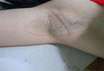 案例三:小门诊做腋臭手术留疤痕--小荷(化名)去年在一家小门诊做腋臭治疗,结果由于术后处理不当,创面发炎感染,愈合期间腋下张力不均,使小荷痛不欲生