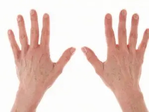 手癣一般都是单手发病,表现干燥性角质增厚,脱屑。